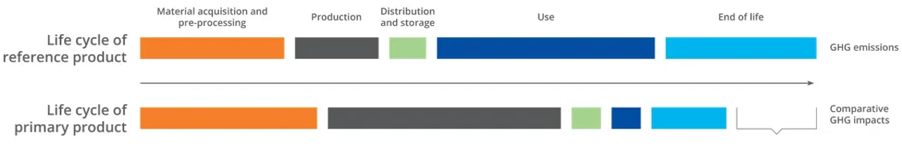 Most guidance documents follow the attributional approach but differ in their specifics. Generally, attributional approaches consider absolute emissions attributable to a specific entity—be it a product, service, or company—over its life cycle, known as a life cycle assessment (“LCA”) (Russell 2019). This cradle-to-grave emission total is compared to a reference product, with the comparative emissions impacts denoted as those emissions avoided. Such assessments should adhere to best-practice LCA frameworks, such as those published by the Greenhouse Gas Protocol (Bhatia et al. 2013).